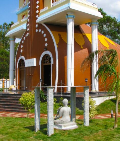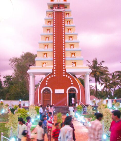 SAPTHASWARA DEVATHA DHYANA MANDIRA is a special place for spiritual and musical activities, located in the quiet town of Rudrapattana, Arakalagudu Taluk, Hassan District. Completed in 2008 for the famous singer Sri R K Padmanabh, this unique building has an innovative design.
