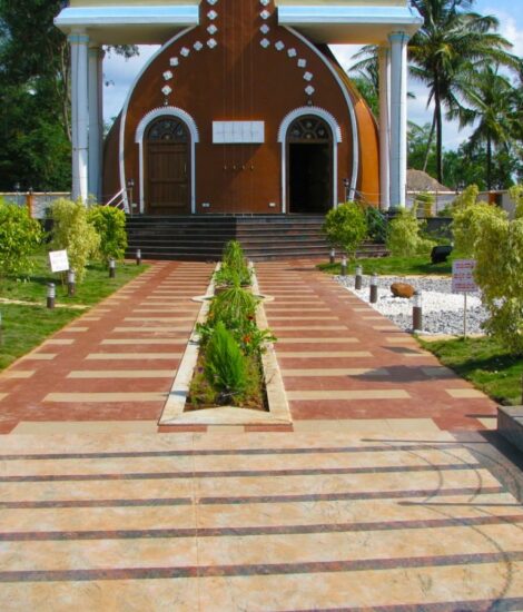 The building is shaped like a Thamburi, a musical instrument, and sits on a star-shaped base, making it the first of its kind.